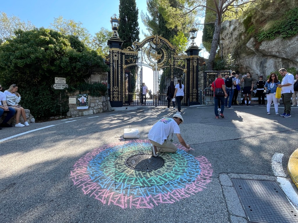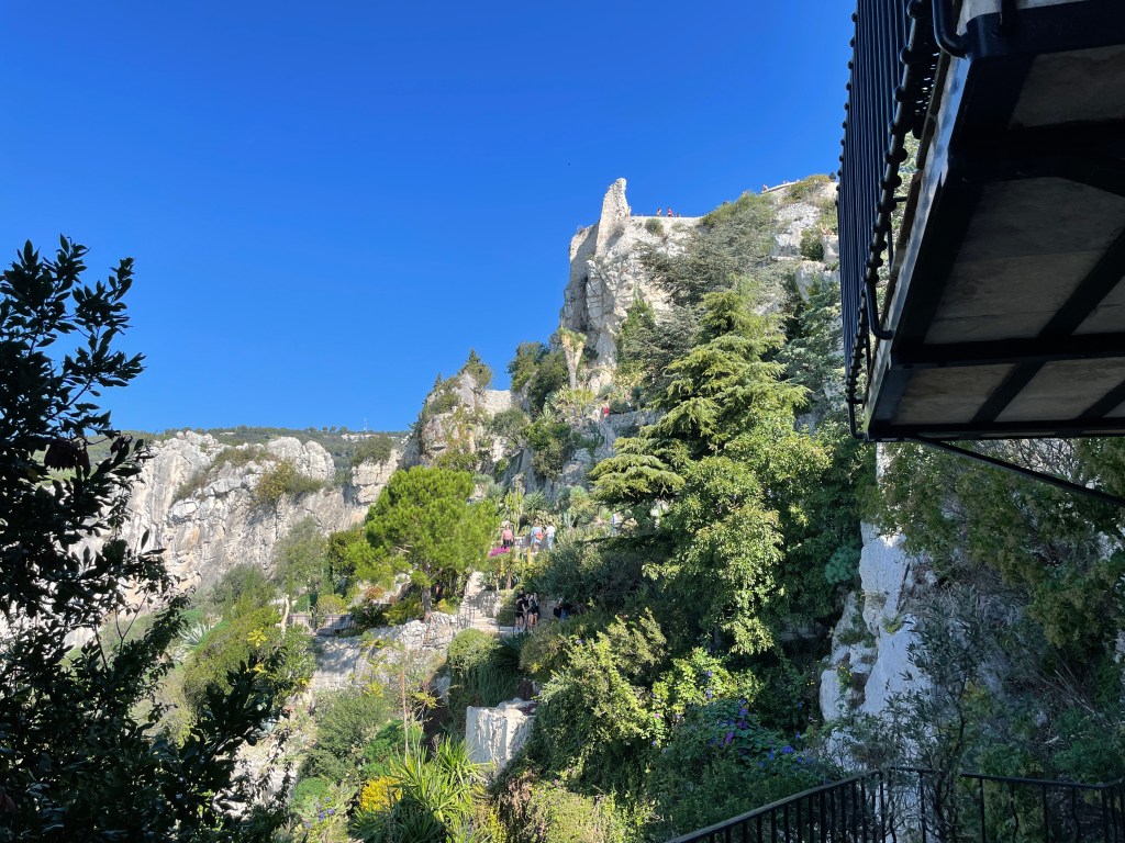 But of course a perfumeur on the climb up Up and up on the twisty little passagesAt the top! – to be revisited later for a nice dinner, I thinkThe views from this restaurant are literally breathtakingIncredible cliffs and do you see the observation platform?On the way down … the chalk artists perform