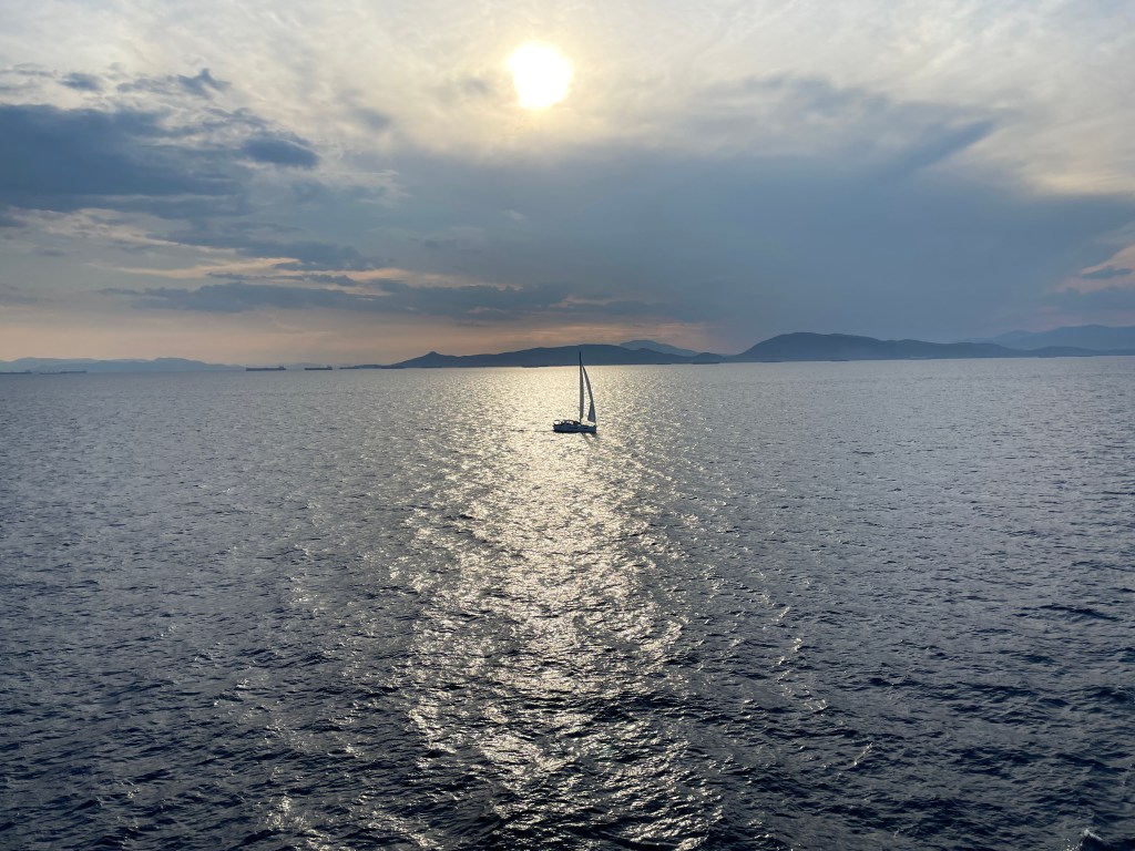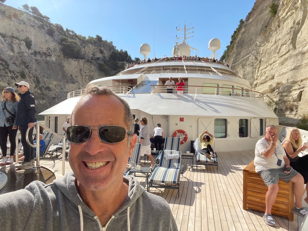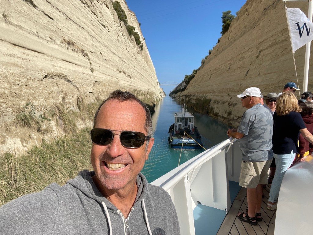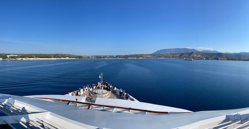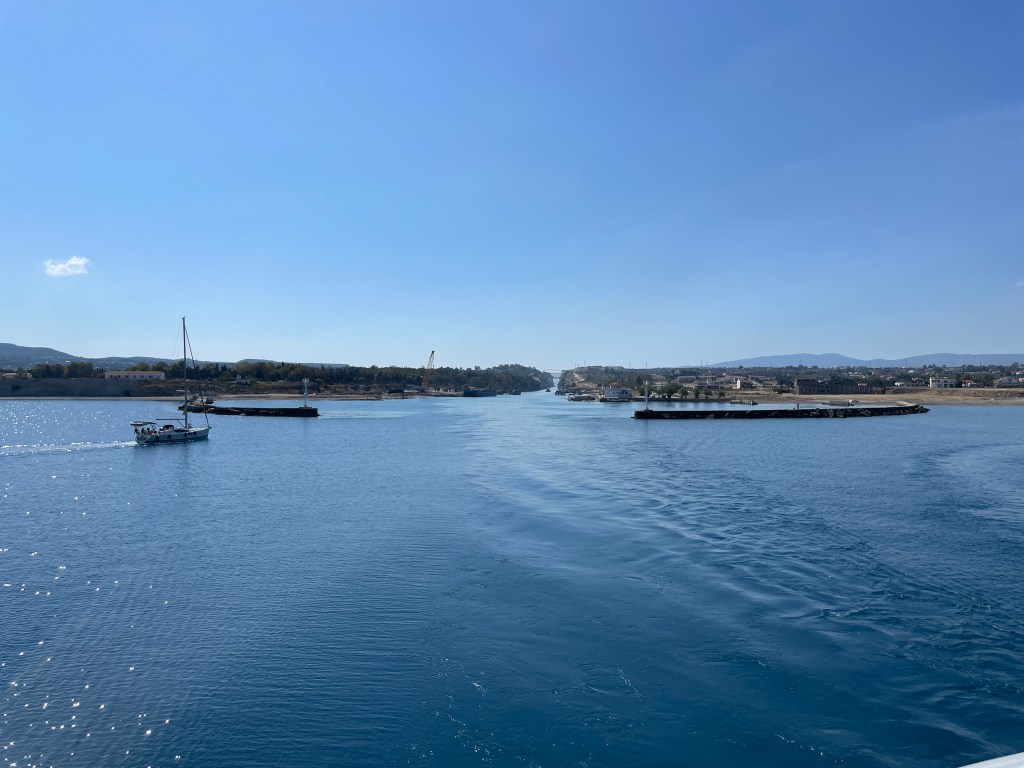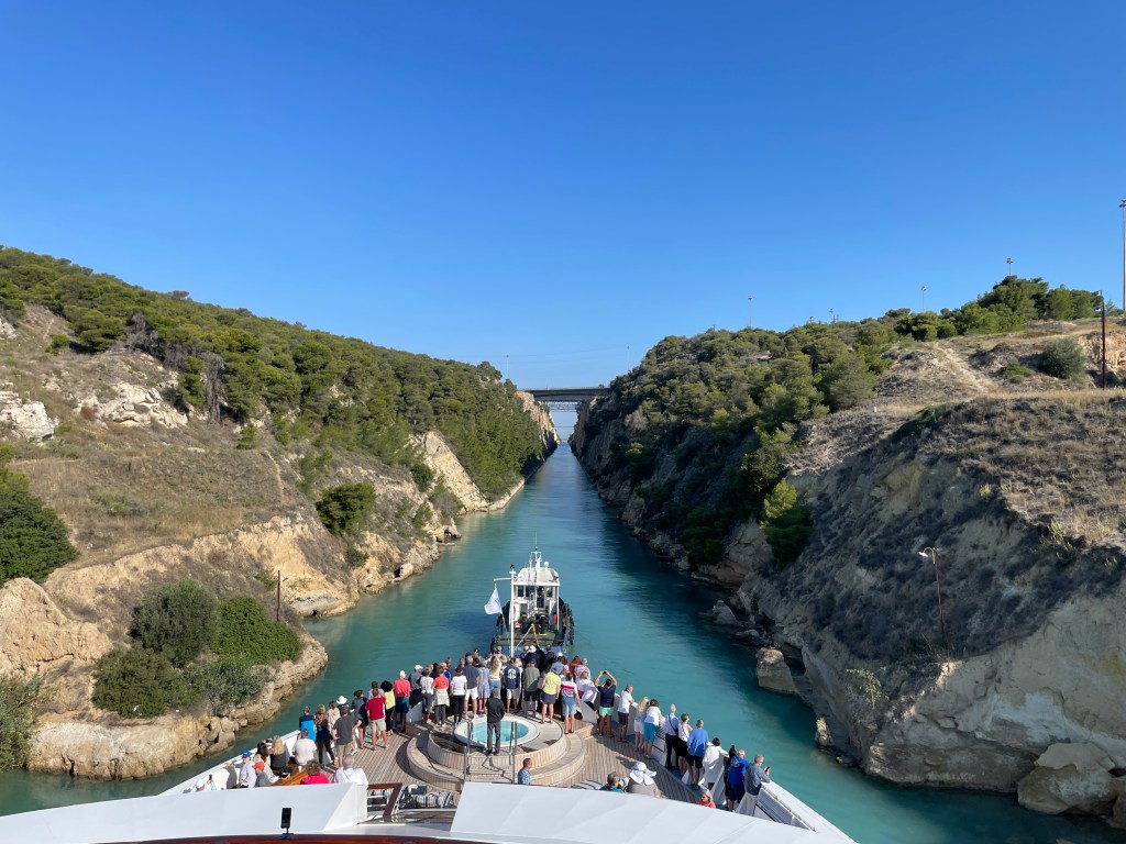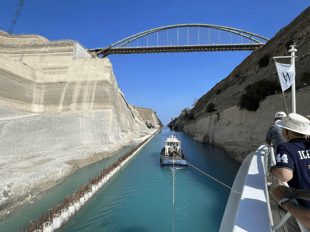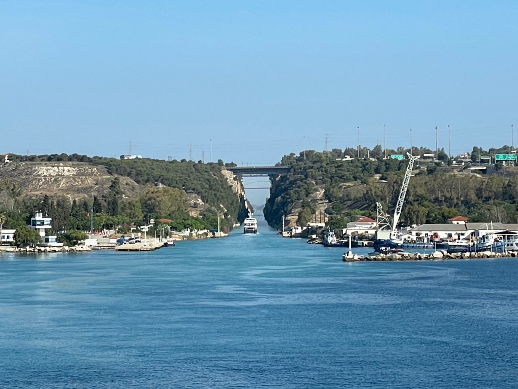 Overnight we voyaged from Piraeus, the harbor town of Athens, to the opening of the Corinth canal, an 18th century man-made shortcut across the neck of the Peloponnesian peninsula.