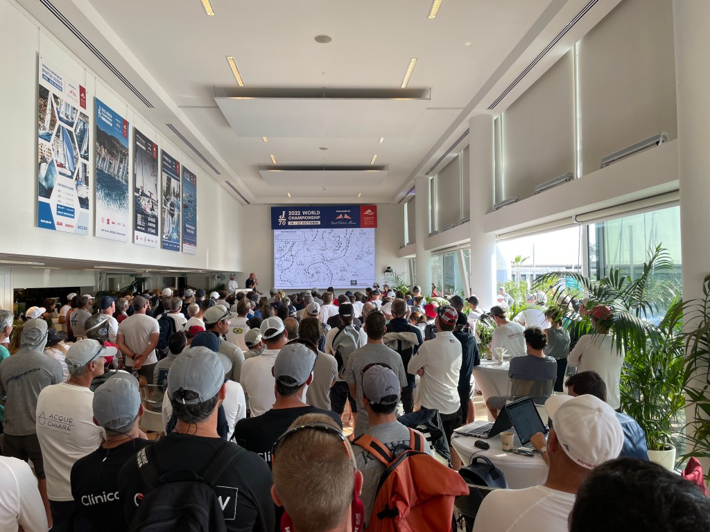 The competitor briefing was somber as the Race Committee and fleet contemplated another day of sitting around. They will make hour by hour delays until 1500, then call it for the day.