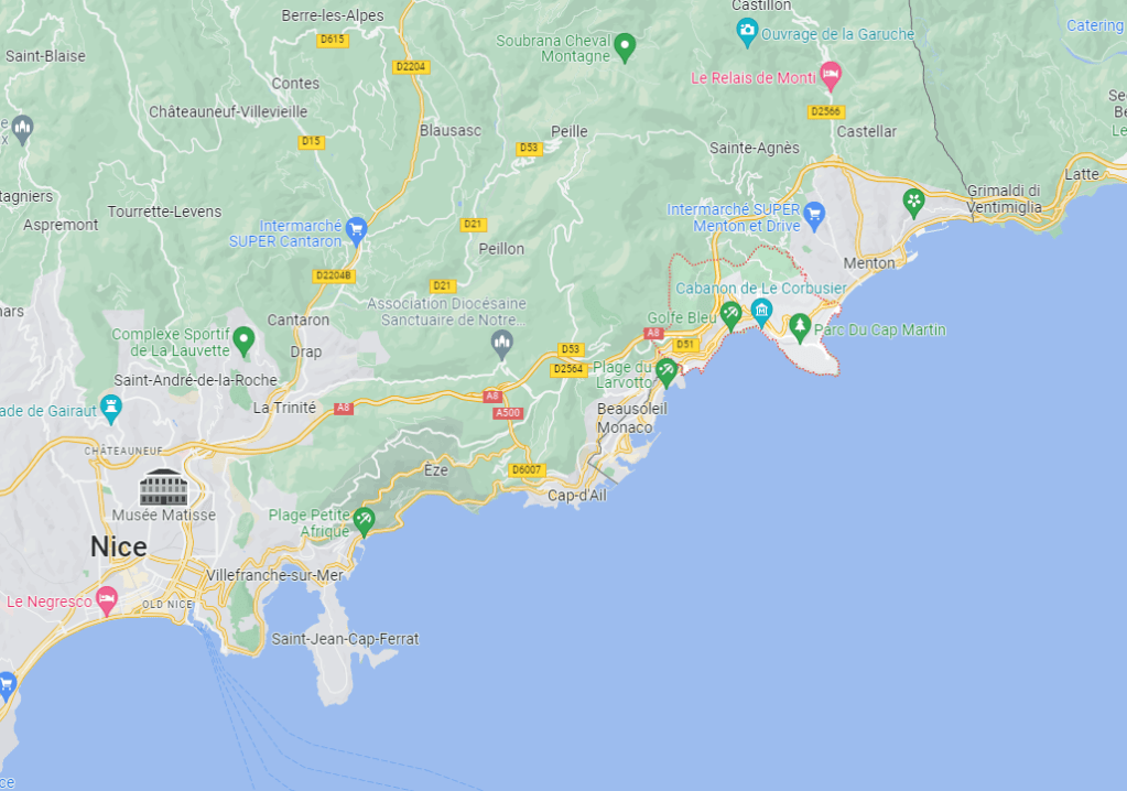 We tend to think of Monaco as being on the border between France and Italy, but actually there is some France to the East of Monaco: Cap Martin and Menton. See the map!