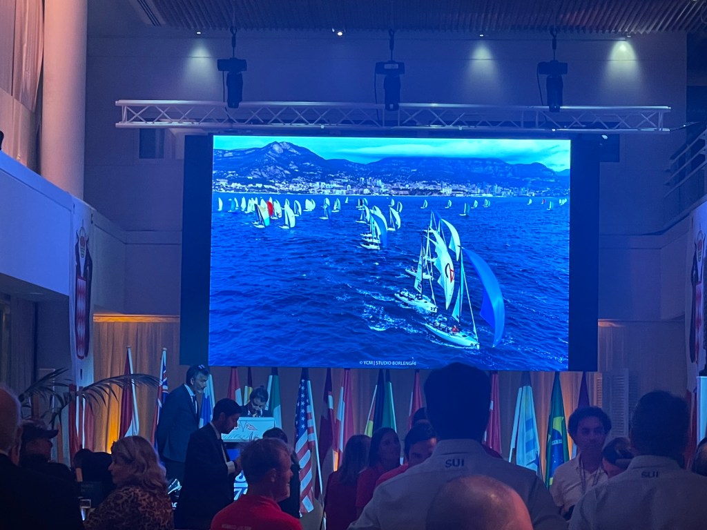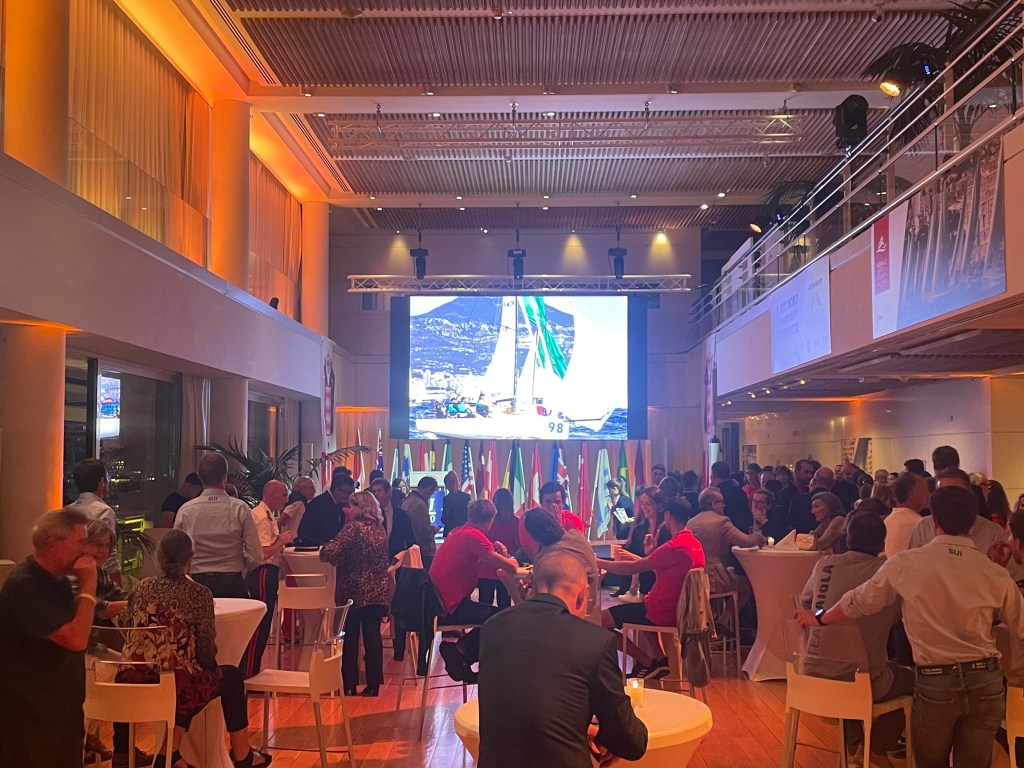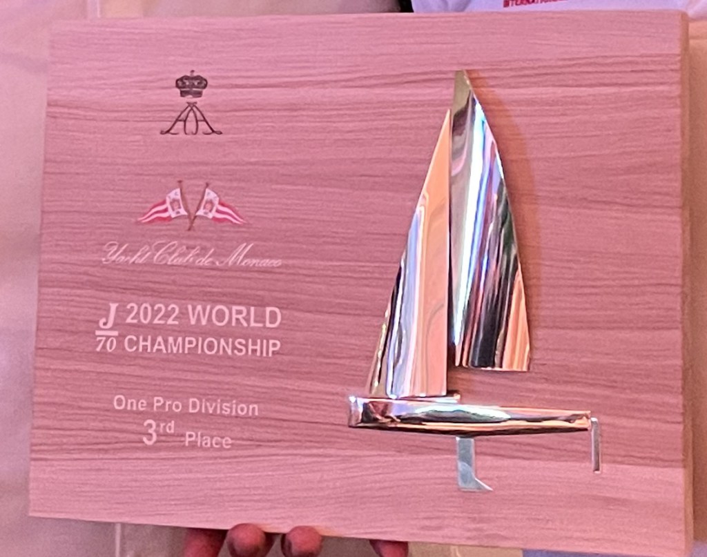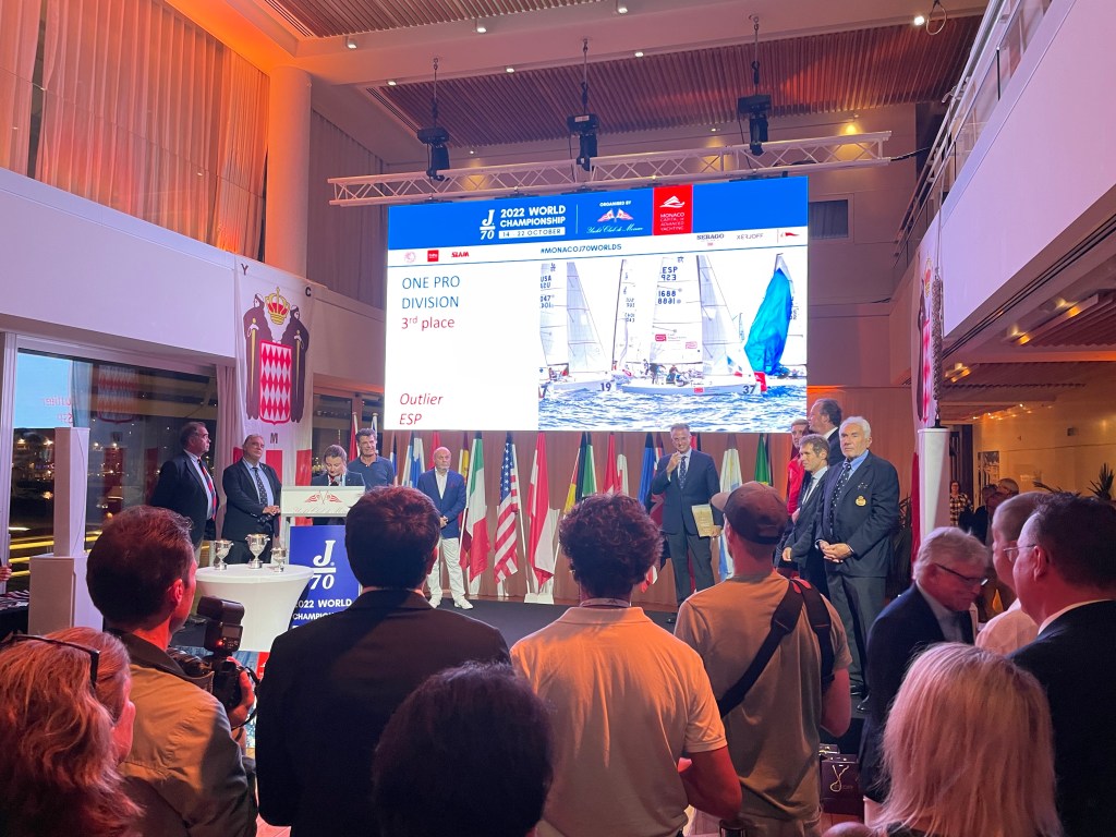 at the trophy presentation – Yacht Club de Monacoslide show with drone shots of the race played before the ceremonywe are announced! – Outlier, third in the One Pro division (and 28th overall – woo hoo)our spoils