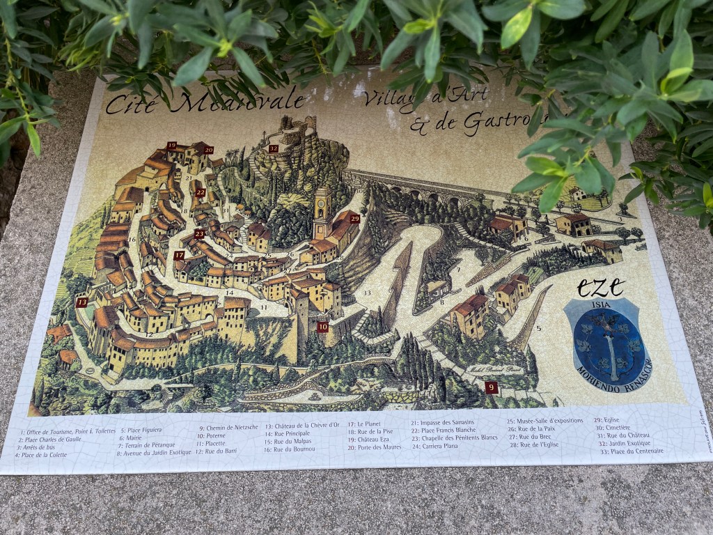 a pictorial map of Eze … #19 is Chateau Esa at the very tip of the mountain, basically hanging off the sideinside the charming churchthe Place du Planet I don’t think there is a Plan B 🙂