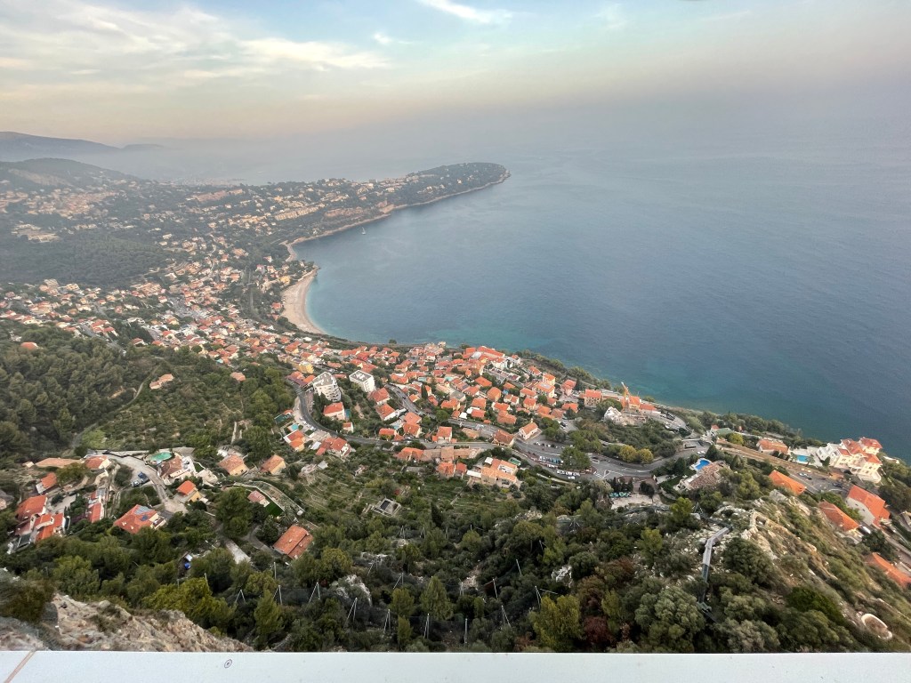 In the distance on the left, Cap Ferrat, with Nice around the corner to the right. Further off in the distance, Cap d’Antibe, and then Cannes…