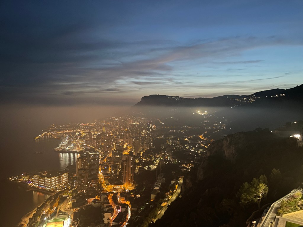 Monaco in the middle, Cap Ferrat and Nice to the left, Cap Martin and Menton to the right