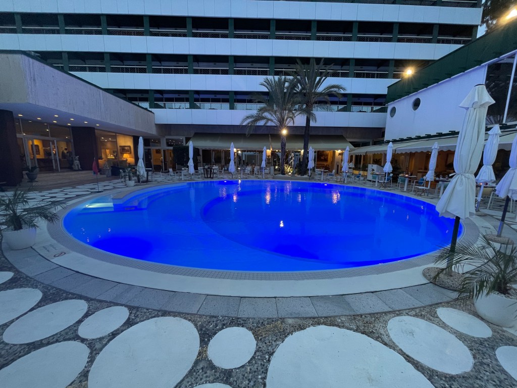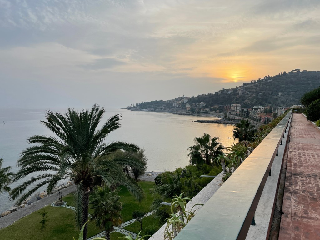 Headed back along the coast – beautiful! – and stopped at the Grand Hotel del Mare in Bordighera for a drink. Dated and kitschy, but in a neat way. Time to kill before dinner, and a nice drink with a nice view is always … nice 🙂