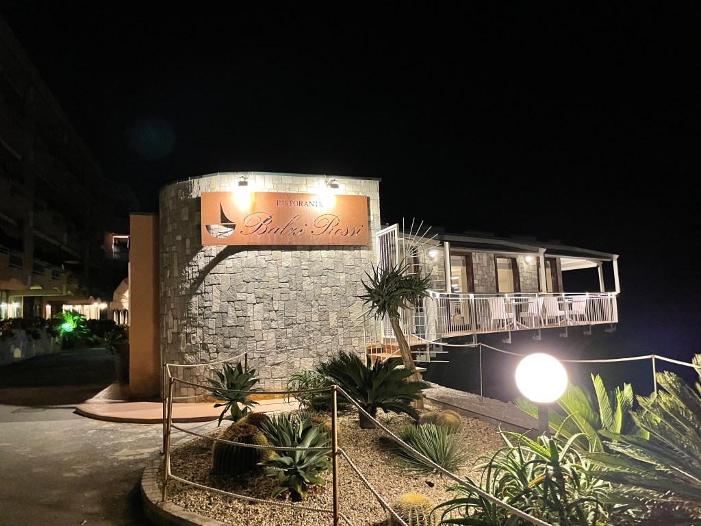 After a bit of tooling around, I ended up at a restaurant called Balzi Rossi, which is just – just! – the Italian side of the border. (I mean, you can literally see the French border from the windows.). Nice view of the water – nice view of Menton, where I was yesterday – and a beautiful seafood dinner.