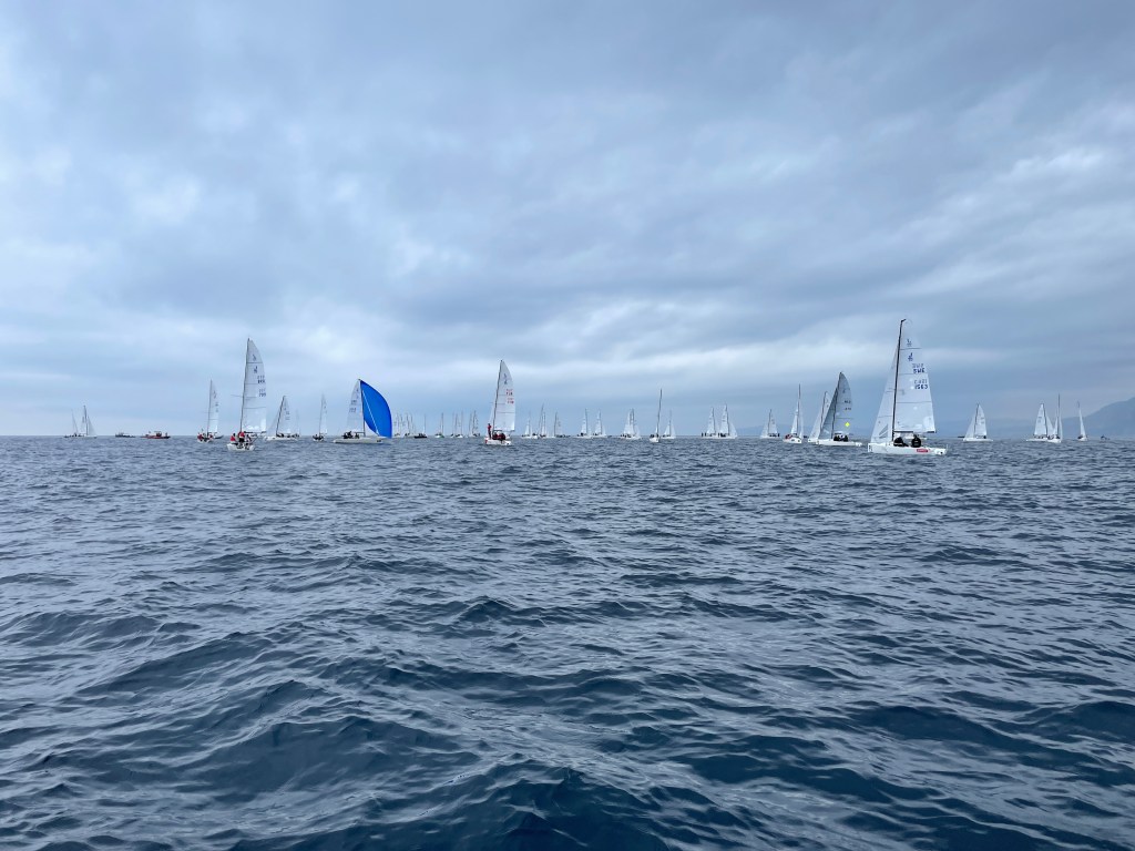 the fleet heads out to give it a try … but still no wind100 J/70s bobbing around, waiting for enough wind to race