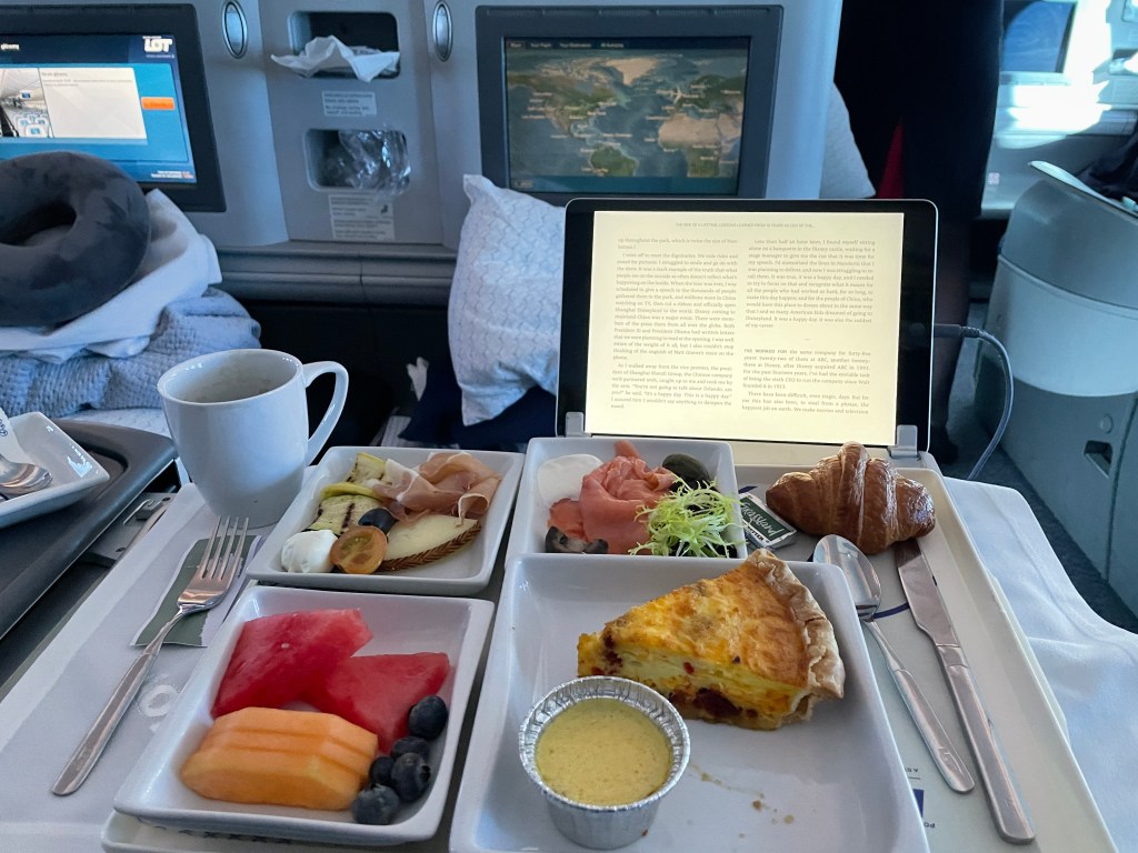 Flight pleasantly old school, no WiFi – reading Bob Iger’s memoir Ride of a Lifetime (great so far), sleep score 72 (per Oura) – food outstanding, service impeccable. Why can’t US airlines do this anymore?